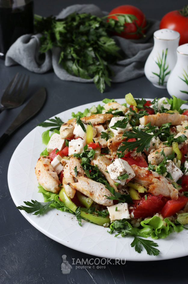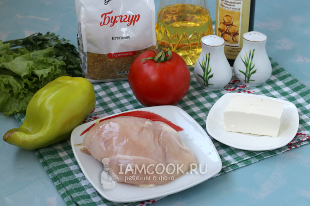 Для приготовления салата с булгуром и курицей возьмите из списка необходимые ингредиенты.