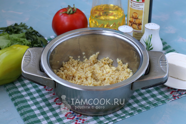 Булгур сварить в кастрюле до готовности, остудить и разрыхлить вилкой. Посолить булгур во время варки.
