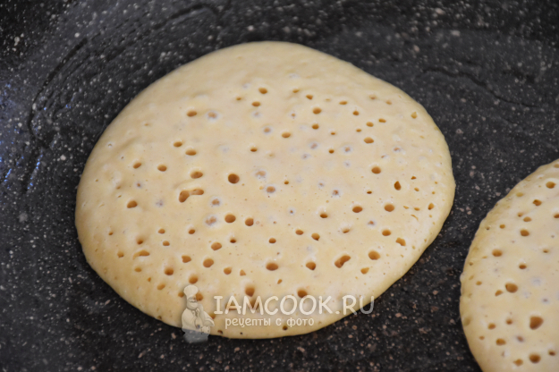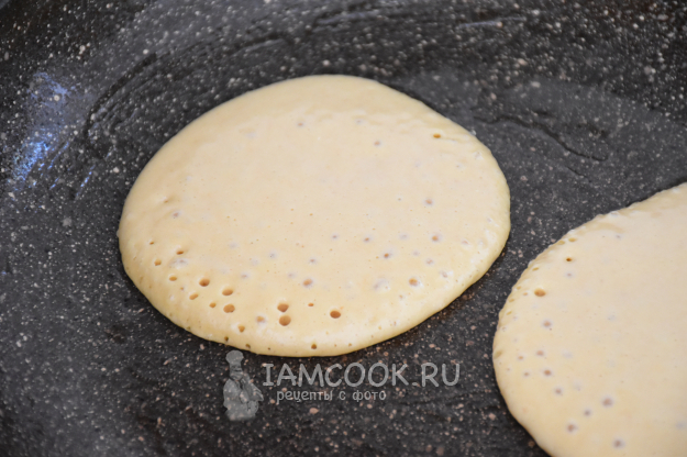 Как только на поверхности появятся небольшие пузырьки, перевернуть оладьи и выпекать 1-2 минуты.