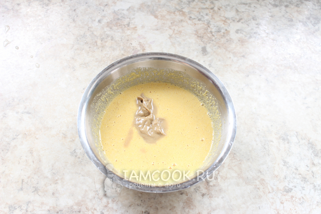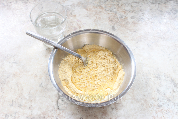 Вливаем небольшими порциями 200 мл холодной чистой воды, помешиваем, чтобы не образовались комочки.