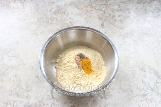 Соединяем в сухой миске нутовую муку, соль и специи. Я использую адыгейскую соль с чесноком. Перемешиваем сухие ингредиенты. Пряности можно взять другие, по вашему вкусу.