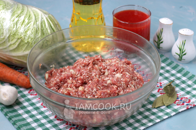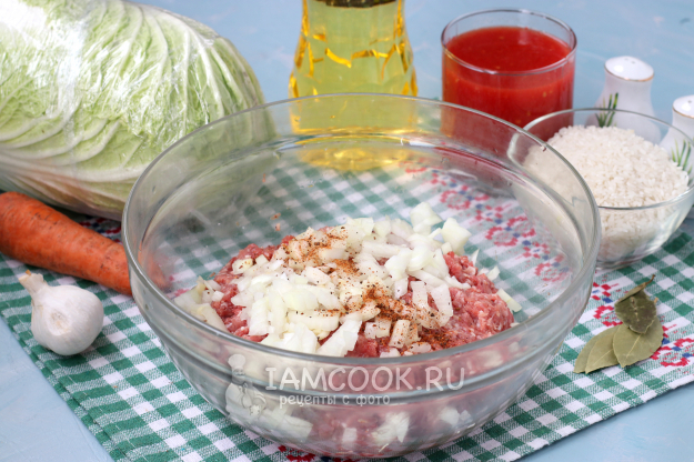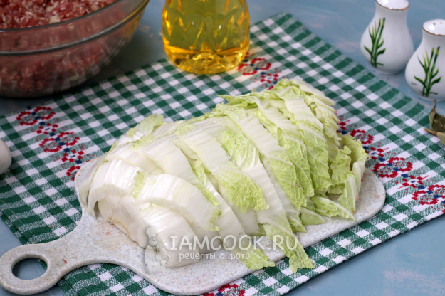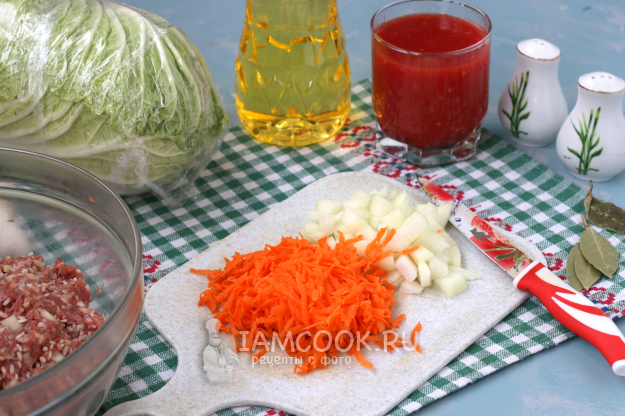 Для приготовления ленивых голубцов из фарша и риса с пекинской капустой подготовить из списка необходимые ингредиенты.
