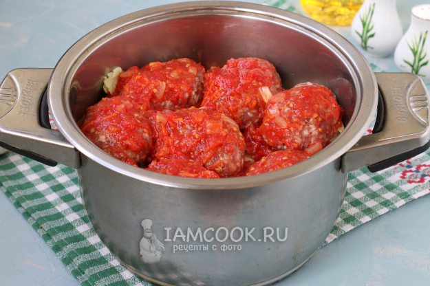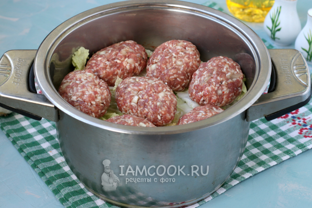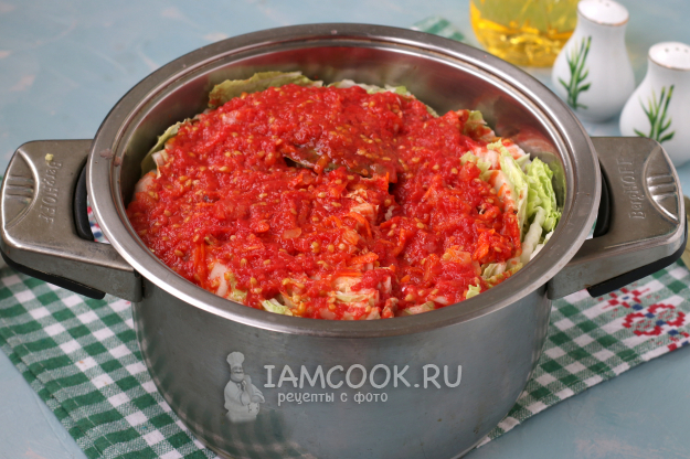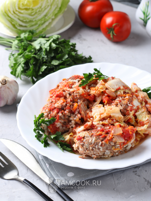 Налить на дно немного томатной заливки, затем выложить слой пекинской капусты, на неё - слой котлет. Полить котлеты ещё частью заливки и выложить следующий слой капусты. Далее снова выложить слой котлет.