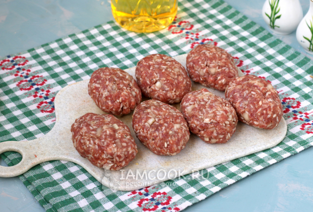 Мясной фарш поместить в глубокую миску, посолить и поперчить, добавить половину измельчённого лука и зубчик чеснока.