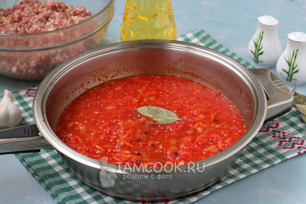 Разогреть в сковороде подсолнечное масло, добавить лук с морковью, немного обжарить до прозрачности лука. Налить в сковороду томатный сок, добавить сахар, соль и перец. Вместо молотого перца можно использовать перец горошком. Соус довести до кипения, добавить лавровый лист. Накрыть крышкой и выключить огонь.