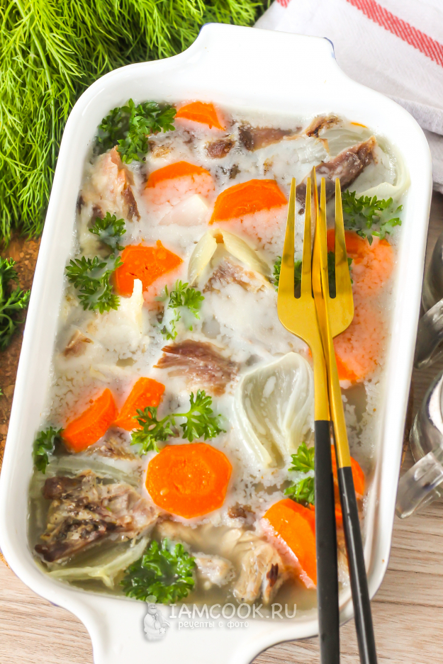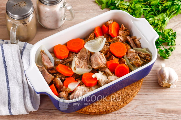 Извлеките рульки и овощи из бульона. Рульки чуть остудите и разберите, отставляя кожу и сало в сторону - они не понадобятся для холодца. Мясо выложите в форму, в которой собираетесь подавать заливное. Отварные овощи нарежьте кружочками или ломтиками, выложите в форму.