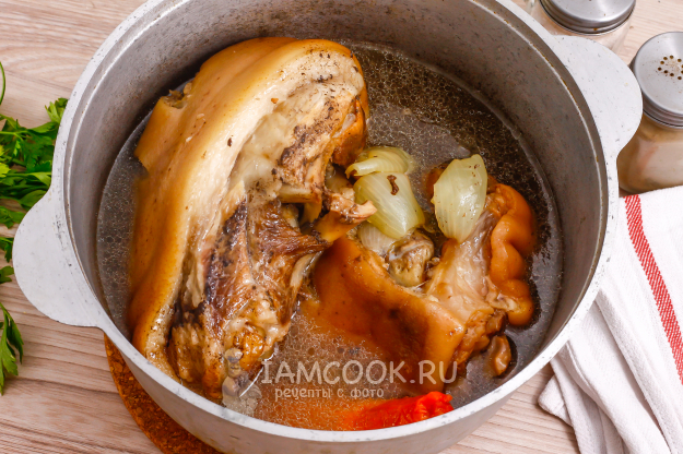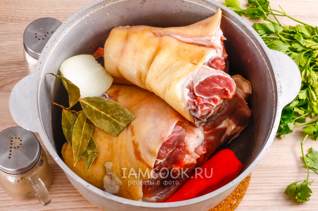 Подготовьте необходимые ингредиенты для создания холодца из свиных рулек с желатином (заливного).