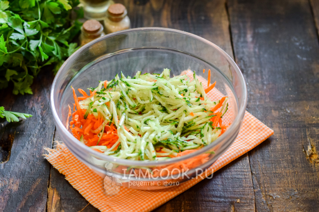 Переложить морковь в салатник. Огурцы вымыть и просушить, обрезать хвостики. Натереть огурцы аналогично моркови. Если огурцы сильно водянистые, можно аккуратно отжать лишнюю жидкость. Добавить огурцы к моркови.