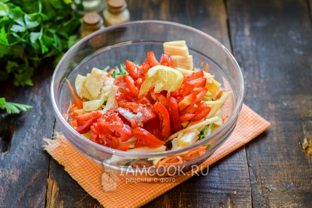 Помидоры вымыть и просушить, удалить место роста плодоножки. Нарезать помидоры полосочками и добавить в салат.