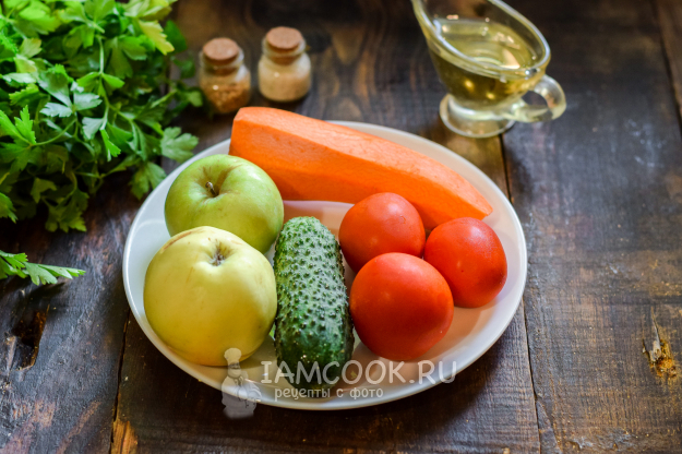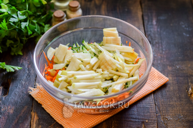 Яблоки почистить от кожуры, удалить сердцевину. Нарезать яблоки тонкими небольшими полосочками, добавить в салат к овощам.