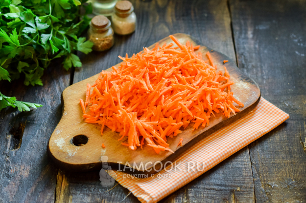 Очистить морковь и вымыть, просушить. После натереть морковь на средней терке, также можно использовать терку для корейских салатов.