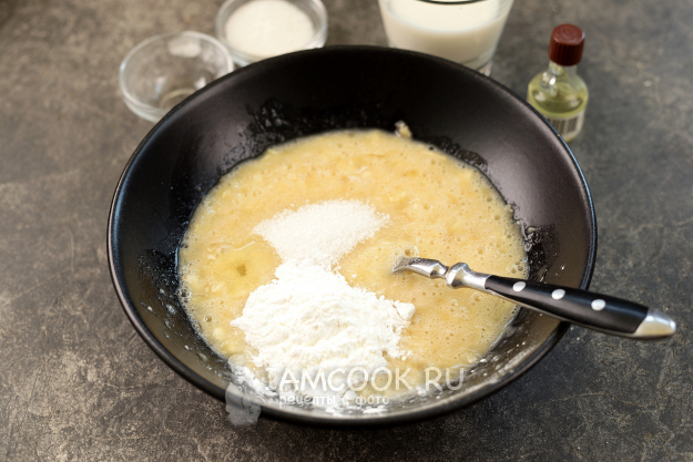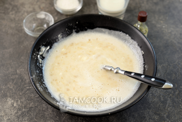 Интенсивно перемешайте массу, чтобы не образовались комочки от крахмала. Дайте тесту постоять пару-тройку минут.