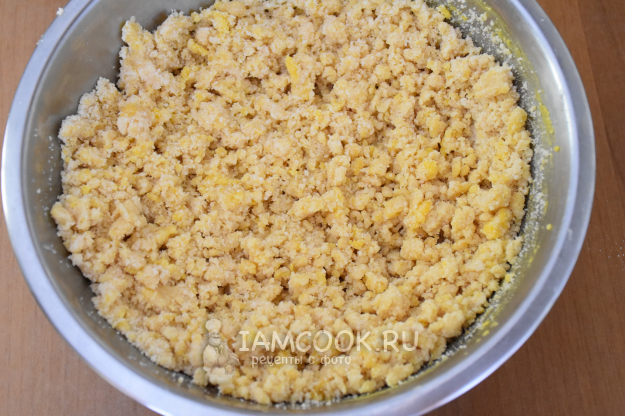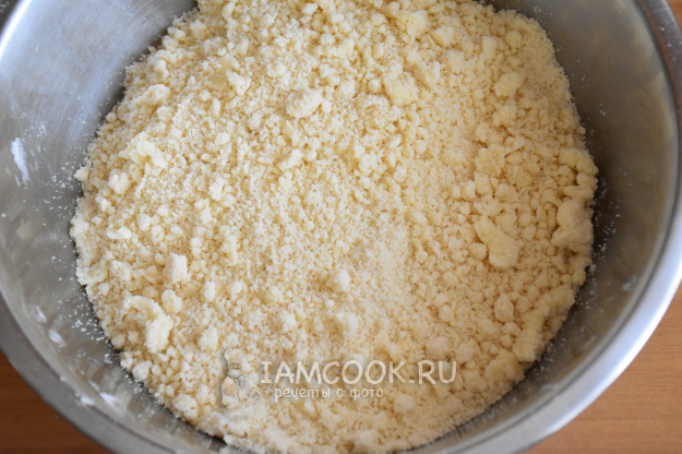 В миске соединить муку и нарезанное на небольшие кубики сливочное масло. Быстро растереть в крошку.