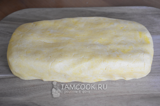 Выложить тесто на рабочую поверхность и собрать в ком. Сформировать из него прямоугольник, завернуть в пищевую пленку и положить в холодильник минимум на 2 часа, чтобы тесто стало плотнее и его проще было раскатывать.
