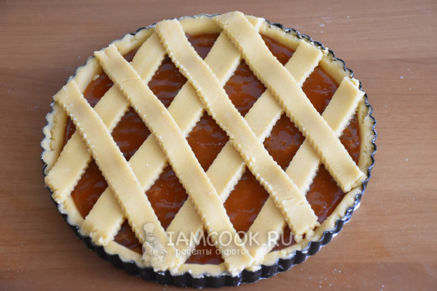 Выложить аккуратно полоски из теста поверх джема в виде решетки.