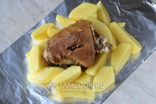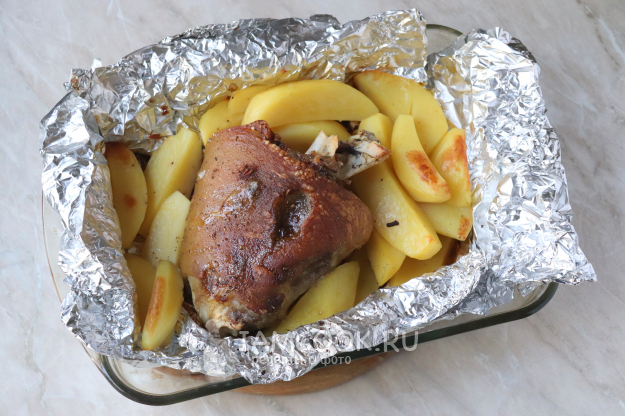 Запекать свиную рульку с картошкой в фольге в духовке в течение часа. За 5-10 минут до готовности фольгу аккуратно, чтобы не обжечься паром, открыть и включить верхний нагрев (если это позволяет духовка).