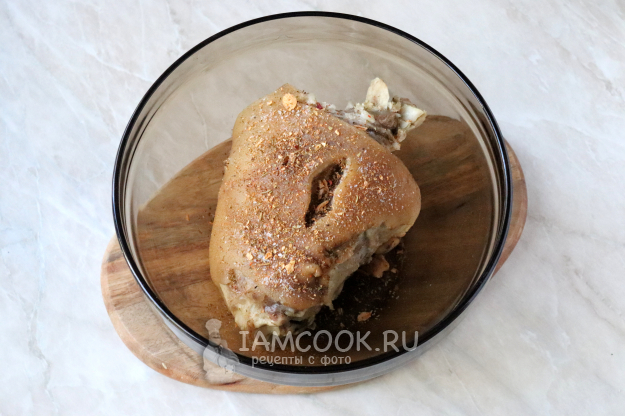 По истечению времени достать рульку из бульона и дать немного остыть, после чего щедро натереть приправой для мяса.
