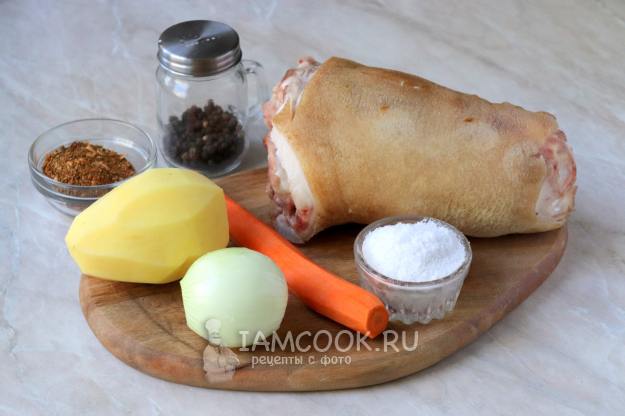 Чтобы запечь свиную рульку с картошкой в фольге в духовке, надо сразу подготовить необходимые продукты по списку.