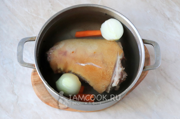 Рульку тщательно помыть под холодной проточной водой, поскоблить ножом, ополоснуть и выложить в объемную кастрюлю. Добавить очищенный лук, морковь, столовую ложку соли и чёрный перец горошком.