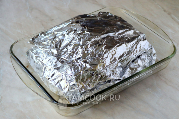 На двойной слой фольги выложить мясо и картошку. Плотно завернуть, чтобы не было открытых участков.