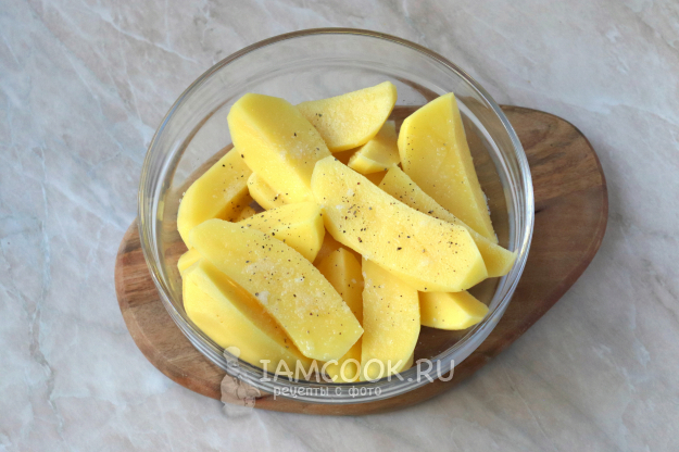 Картофель очистить от кожуры, крупные клубни разрезать пополам или на четыре части, мелкие - оставить в целом виде.