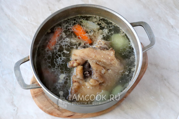 Варочную ёмкость отправить на огонь и довести до кипения. После чего снять образовавшуюся пену и варить на медленном огне в течение 1,5 часа до мягкости. Время варки может немного отличаться в зависимости от веса рульки и возраста животного.