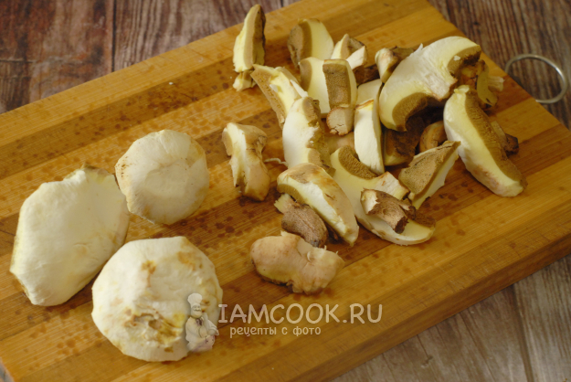 Маслята почистим — ножки очистим от мусора, а со шляпок снимем кожицу. Крупные грибы нарежем кусочками.