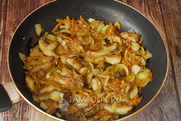 Грибы отожмем от воды, выложим к моркови и луку и поджарим.