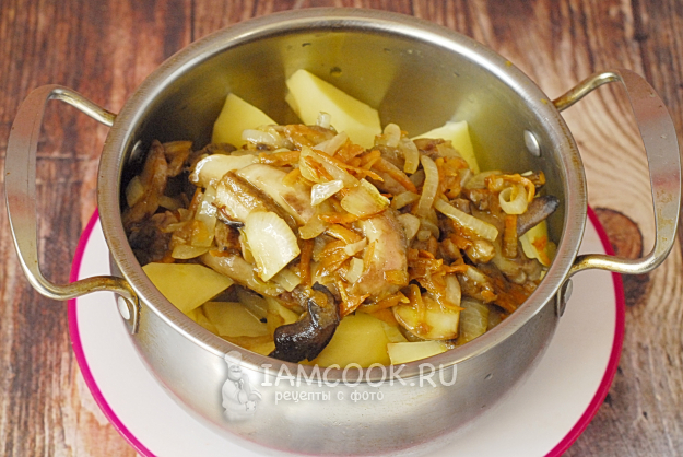 Картошку сложим в кастрюлю, выложим к картошке грибы с луком и морковью.