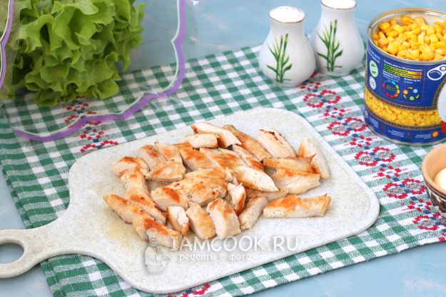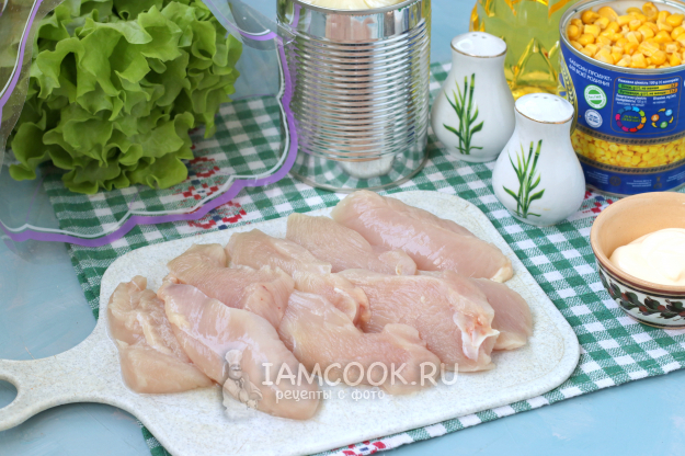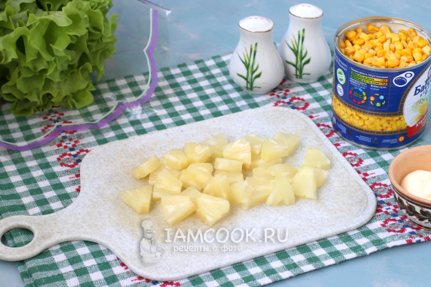 Для приготовления салата «Фантазия» с курицей и консервированным ананасом подготовить из списка необходимые ингредиенты.