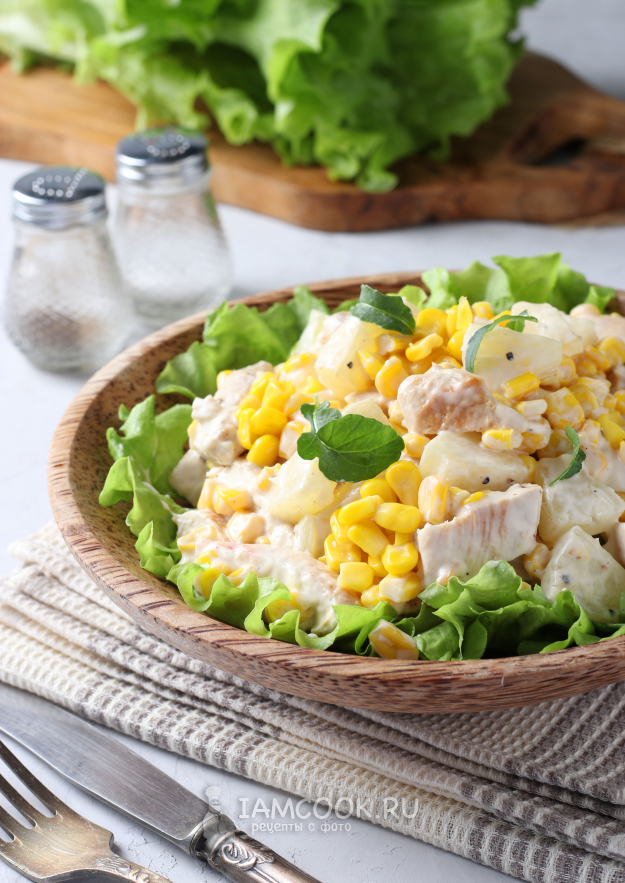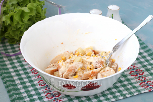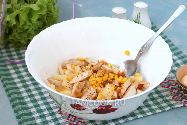 Поместить в глубокую миску курицу и ананасы, добавить к ним консервированную кукурузу, посолить и поперчить.