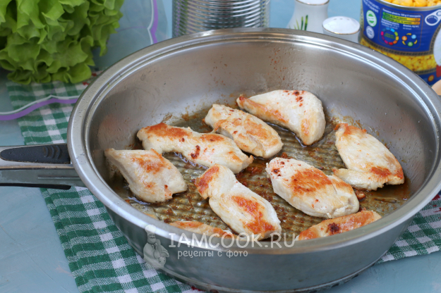 Разогреть в сковороде подсолнечное масло и на сильном огне обжарить курицу. Кусочки должны сразу побелеть, а затем покрыться румяной корочкой, так в них сохранится весь сок. В конце жарки курицу посолить и поперчить. Затем курицу выложить на бумажные полотенца, чтоб убрать лишнее масло и остудить.