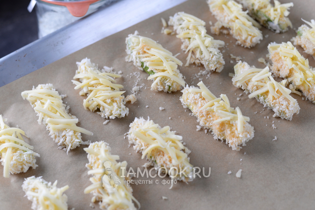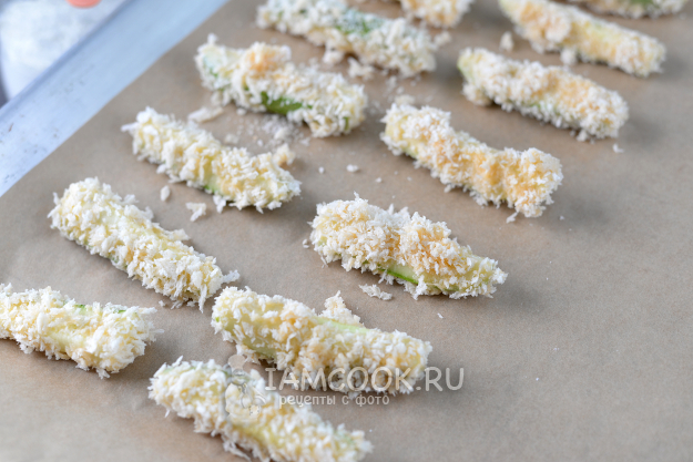Выложите запанированные палочки из кабачка на противень, выстеленный пекарской бумагой.
