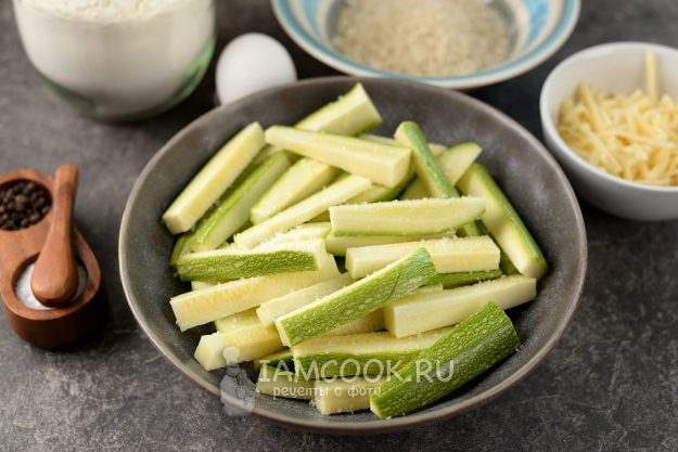 Срежьте концы на кабачках с обеих сторон, овощи нарежьте длинными ломтиками, сложите в глубокую миску, посолите и поперчите.