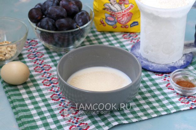 В тёплое молоко добавить дрожжи и чайную ложку сахара, перемешать и оставить на 15 минут, прикрыв салфеткой.