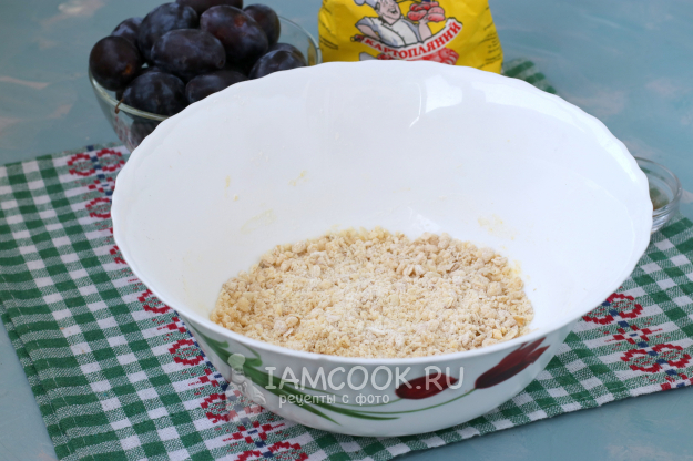 Пока подходит тесто, приготовить штрейзель. Для этого смешать овсяные хлопья, муку, сахар и мягкое сливочное масло. Перетереть всё в крошку. Я добавила ещё горсть миндальных лепестков, но это не обязательно.