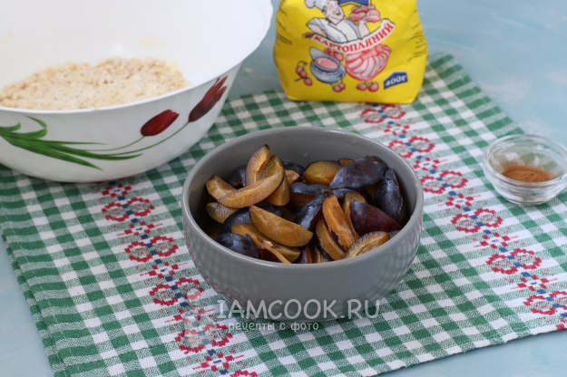 Сливы вымыть и обсушить. Разрезать каждую сливу на 4 части, удаляя косточку.