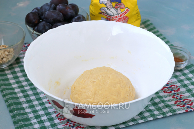 Замесить мягкое тесто, которое не будет липнуть к рукам. Поставить тесто в тёплое место для подхода на 40-45 минут, прикрыв его полотенцем.