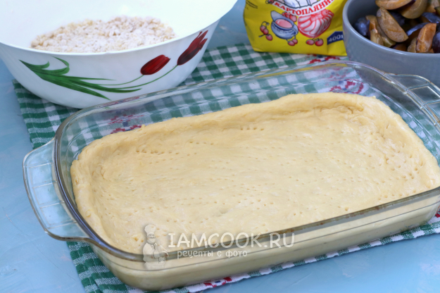 Форму 17x25 см смазать сливочным маслом, подошедшее тесто обмять и раскатать по величине формы, сделать небольшие бортики и наколоть тесто вилкой. В принципе, этот пирог можно выпекать прямо на противне, застеленном пергаментом.