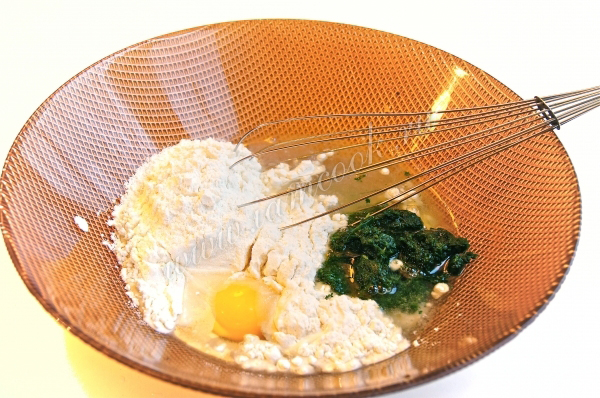 Замесим тесто из муки, воды(молока), яйца, размороженного шпината, посолим по вкусу и добавим разрыхлитель.