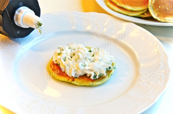 На каждый блинчик выдавим творожную начинку при помощи кулинарного шприца.