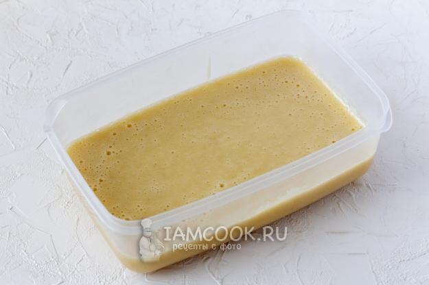 Разлейте яблочное пюре по формам (формочкам, стаканам, креманкам и т.д.). У меня - один большой пластиковый контейнер. Однако если количество желатина вы добавили 15 г, то лучше разливать массу уже по порционным посудинам, так как оно получается более нежным. Остудите немного пюре при комнатной температуре, а затем поставьте в холодильник до полного застывания.