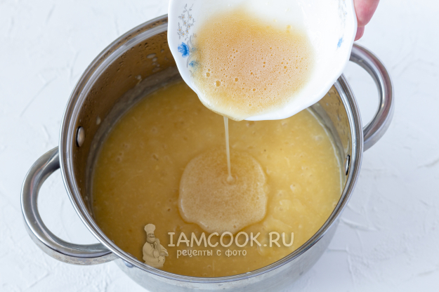 Затем разбухший желатин растопите на водяной бане до жидкого состояния (главное, желатин не кипятить!) и влейте в горячее яблочное пюре.