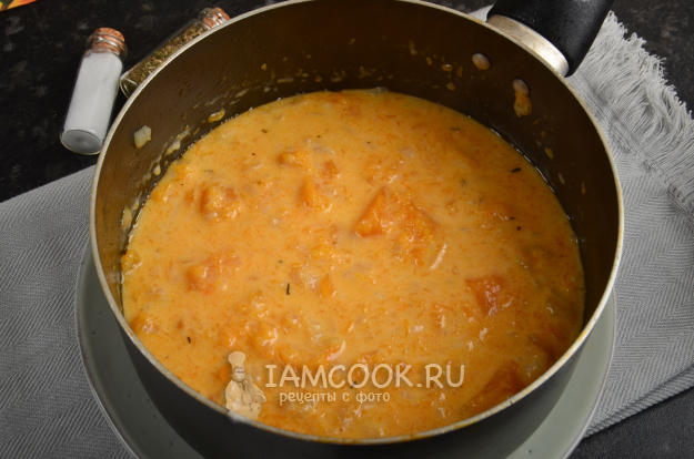Влейте в сотейник столько воды, чтобы она покрыла тыкву. Варите минут 20 на тихом огне - до мягкости тыквы.