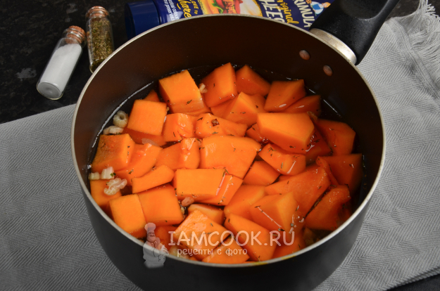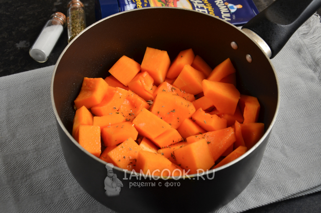 Отправьте кусочки тыквы в сотейник, подсолите и добавьте щепотку сушеных трав (тимьян, базилик, орегано).