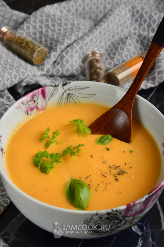Разлейте горячий суп-пюре из тыквы с плавленым сыром по тарелкам, украсьте веточками свежей зелени, сухариками, тертым сыром (пармезаном).