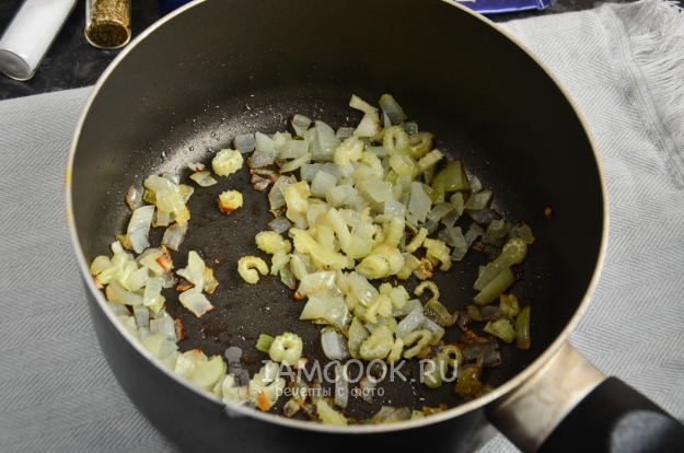 В сотейнике или на сковороде, на рафинированном масле обжаривайте лук с сельдереем в течение 3-4 минут. Сделайте тихий огонь, чтобы овощи не подгорели.