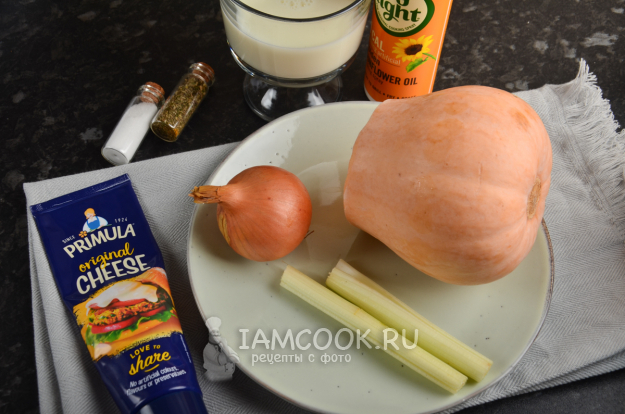 Подготовьте все необходимые продукты для супа-пюре из тыквы с плавленым сыром согласно рецепту. Попробовав базовый вариант, затем можно уже внести свои коррективы, добавляя различные овощи, пряности, травы.