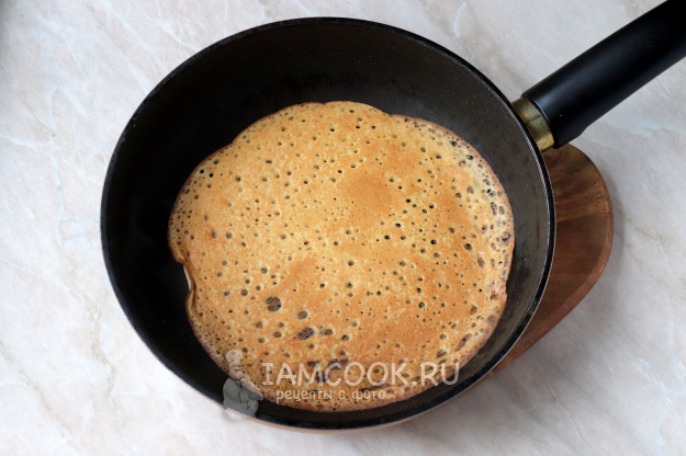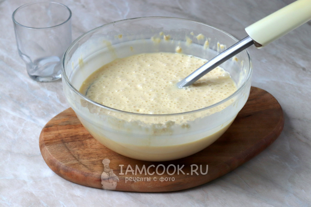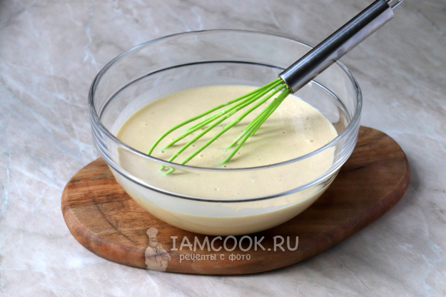 Снова перемешайте, чтобы все мучные комочки разошлись. Тесто должно получиться немного гуще, чем на обычные блины.