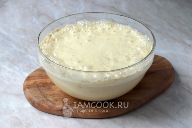 Накройте миску полотенцем и оставьте в тёплом месте на 1 час. За это время оно значительно увеличится в объеме и покроется пузырьками (как на фото).